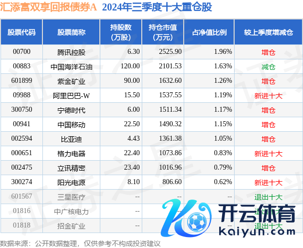 汇添富双享通告债券A为债券型-搀杂二级基金,把柄最新一期基金季报透露,该基金金钱树立:股票占净值比18.92%,债券占净值比106.0%,现款占净值比2.07%。基金十大重仓股如下: