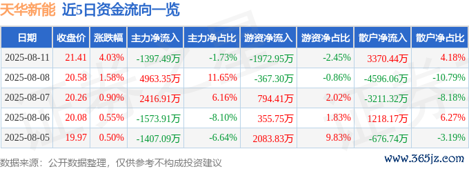 本站音讯,扬弃2025年8月11日收盘,天华新能(300390)报收于21.41元九游体育娱乐网,飞腾4.03%,换手率5.6%,成交量37.62万手,成交额8.07亿元。